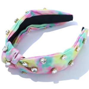 tie dye jeweled knotted headband, this headband is adorned with heart shape clear crystals