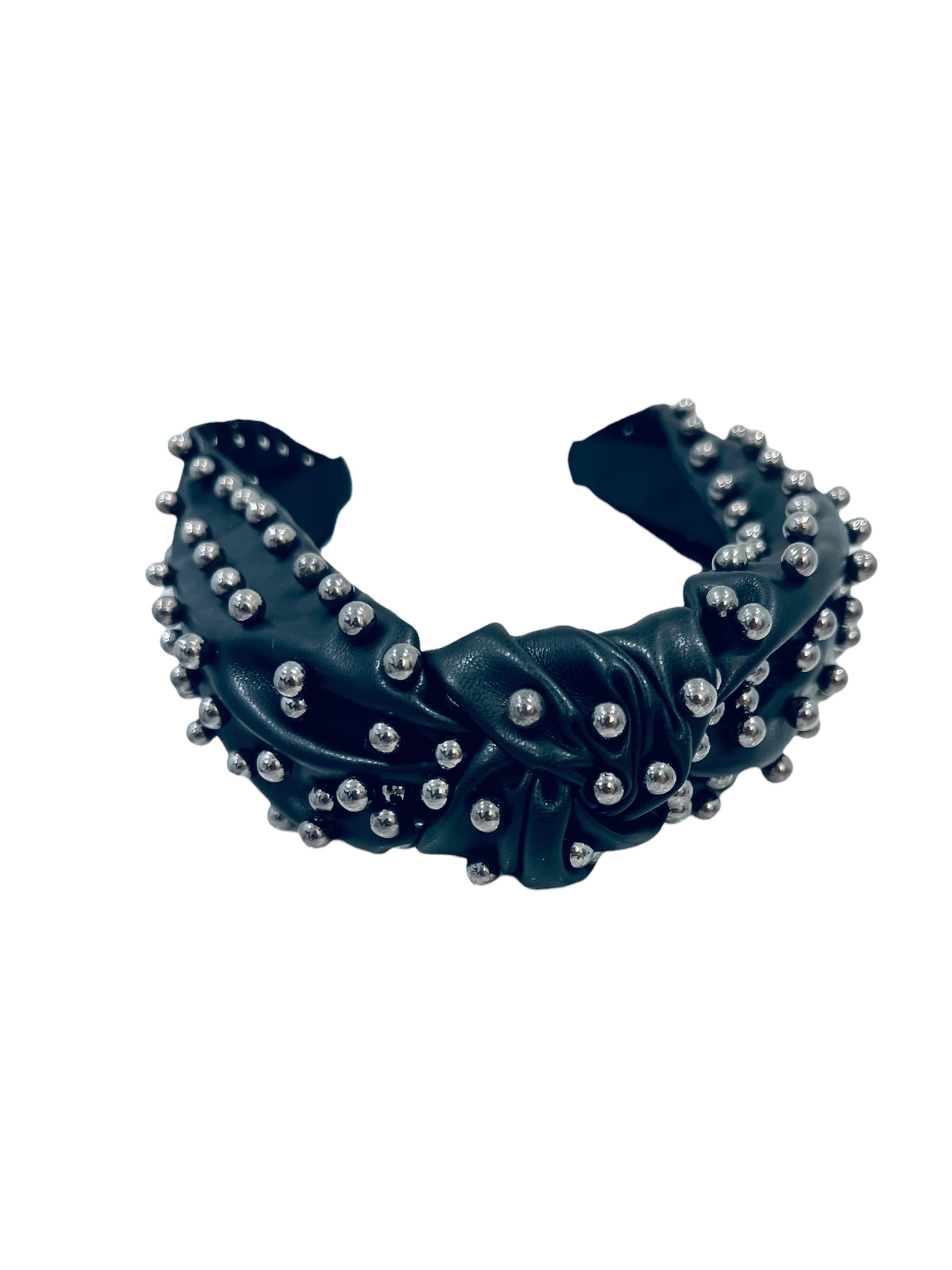 black gun metal pearl jeweled knotted headband, one size fits all for adults and children 4+. This comfort fit headband is adorned with pearl