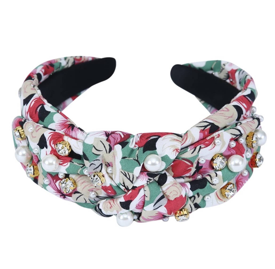 floral jeweled knotted headband, this headband is adorned with clear crystals and pearl embellishments